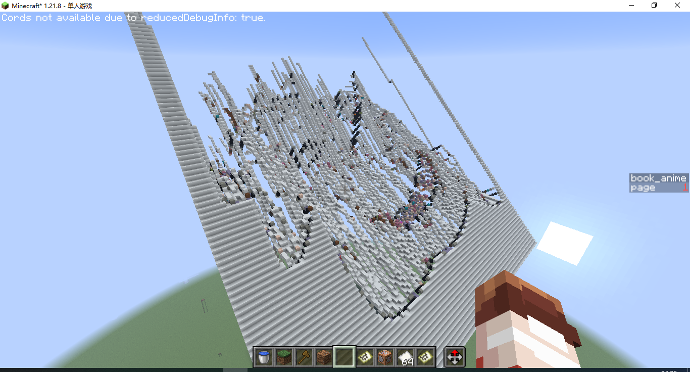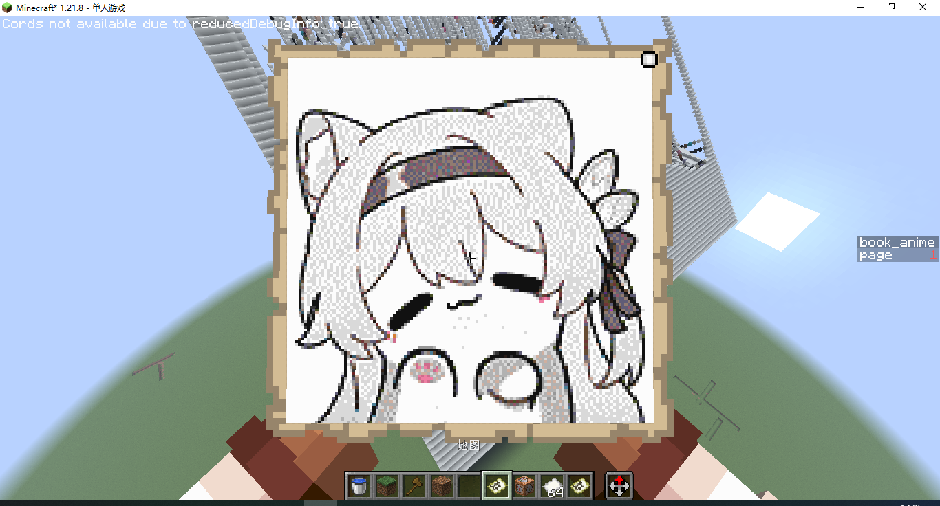 这估计是最普通的像素画了,原理是用程序生成一个mcfuntcion函数文件,里面全是setblock命令,然后执行这个函数即可,这个程序可以生成立体地图画,放在当时可以算是很超前的,不过现在有了更好的软件:SlopeCraft BV1So4y1D7wB