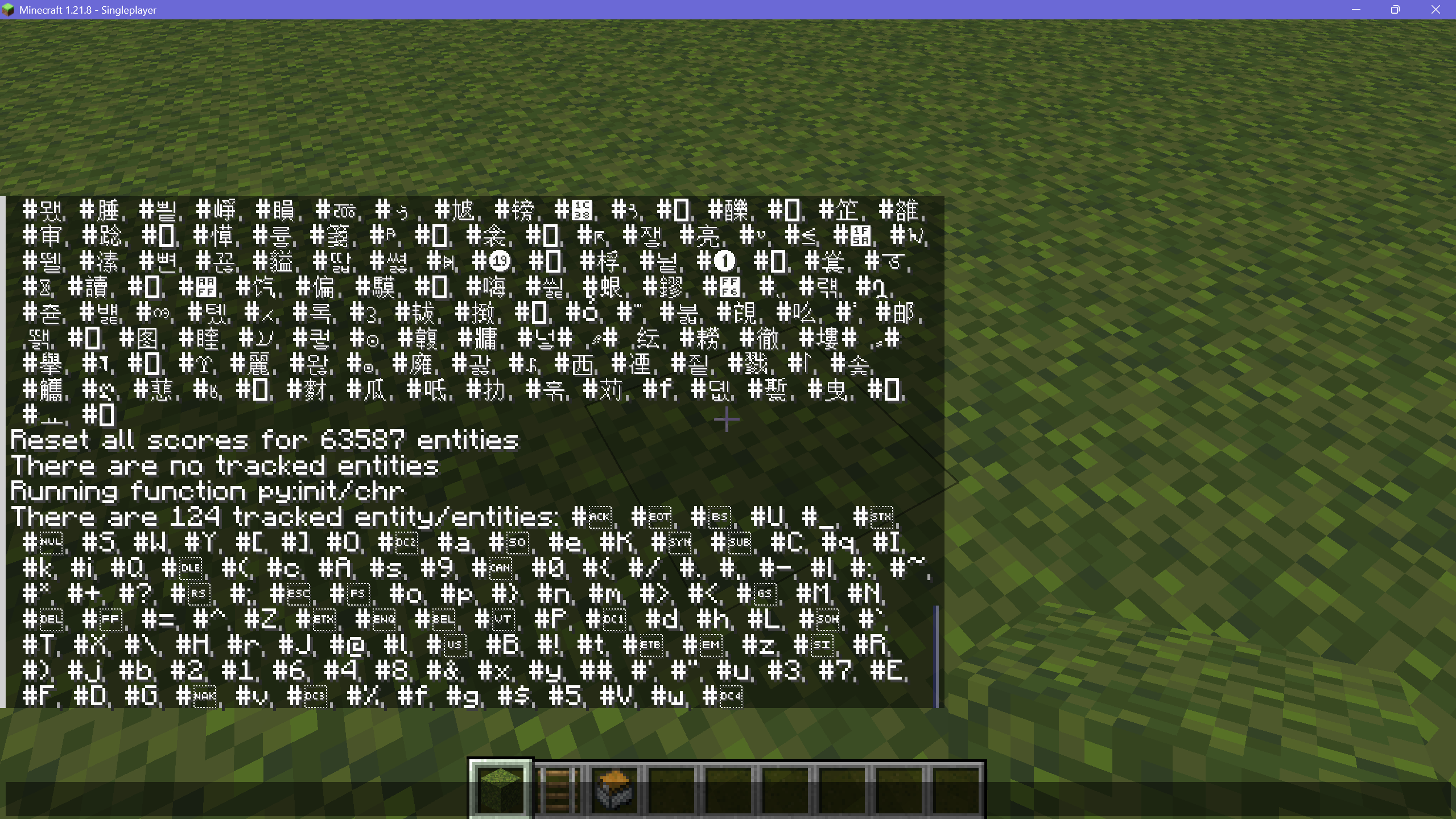 因此,实际编写时,如无特殊需求,请尽量将c-chr计分板的内容限定在ASCII范围内(将下方Python代码第三行的65536改为128即可)。 若读者有部分Unicode范围识别的需要(如实现易语言编译器等),请参照3.1.4节的内容,尽量只保留需要的字符。 如果读者希望实现的包确实有全Unicode BMP范围识别的需要(如实现Python的ord()函数),请考虑在独立的世界中进行该包的编写和测试,以避免巨型计分板对其他数据包效率的干扰。 若读者又确实有与其他数据包并行使用的需求,请考虑在此处牺牲部分效率,改为使用存储NBT进行匹配。