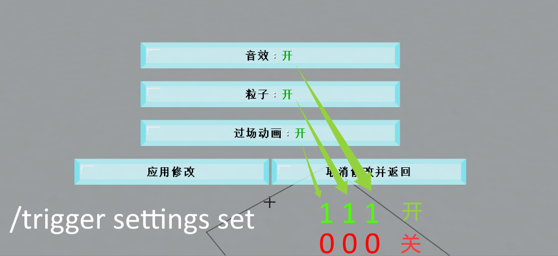 玩家在设置对话框中做好相应调整、点击“应用修改”之后,其在leap_of_crystal_realm.dialog.settings上的分数就会被设为一个长度为3位、每一位上都是0或1的分数。Minecraft的命令系统并没有直接提供按位操作的运算方式。所有现在需要设计一定的算法处理这个数据。